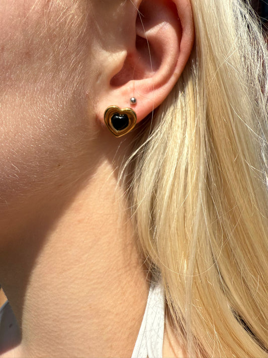 Gigi is a 18k AAA gold plated heart shape earrings with black hearts at the centre