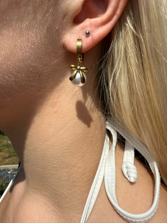 Lilith 18k AAA gold plated drop style pearl gem with a bow detail