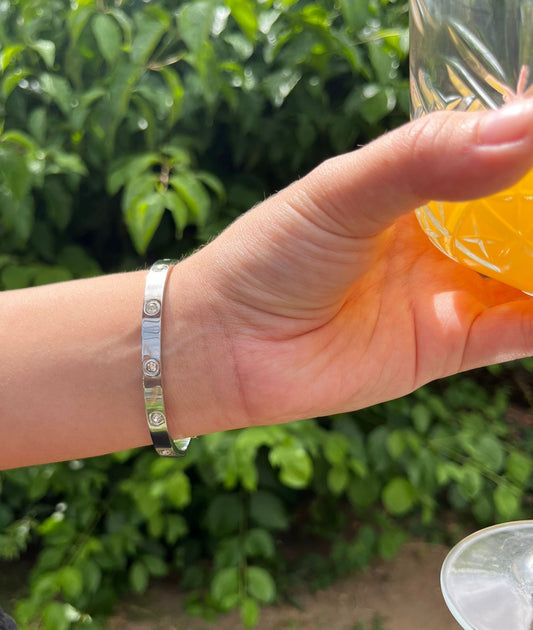 Bella is a stainless steel bangle with small circular zirconia diamonds
